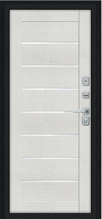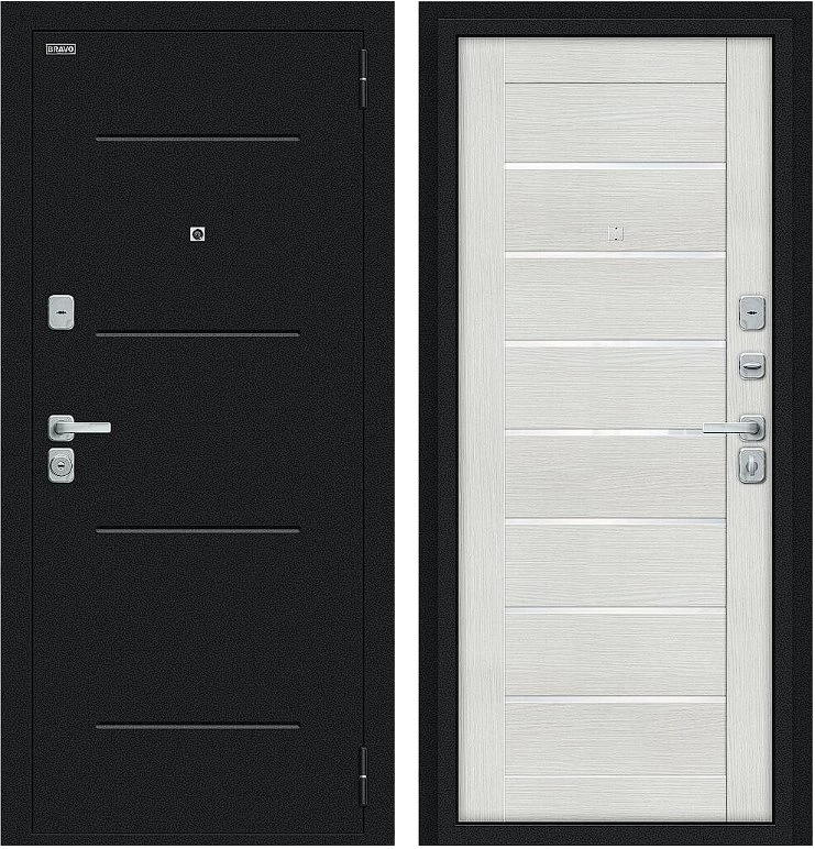 Надежная входная Дверь Браво Техно/BChrome Букле черное/Bianco Melinga премиум класса по цене 34 459 руб. Большая толщина стали защитит от проникновения в ваш дом, квартиру или коттедж. Используется очень качественная фурнитура: замки, цилиндры, ручки, защелки. Покрытие и отделка двери изготовлено под внимательным контролем производителя. Дверь имеет долгий срок службы и гарантию.